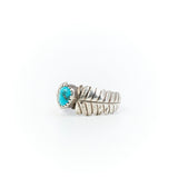 This sweet little ring has a nugget of turquoise, flanked by two unfurling leaves attached to a split shank.