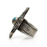 The beefy and beautiful ring feels like it tumbled from a treasure chest. The jewel tones, surrounding the candy-like turquoise center feel luxurious amongst a robust silver setting. An interesting style from Central Asia.