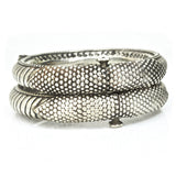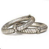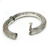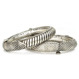 A fantastic pair of High-quality Rajasthani bangles with a candy cane stripe and a beaded decorative shield. The screw-on hinge pins require a touch of coordination but guarantee a super secure fit.
