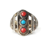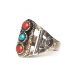 Our favorite combination to see in a piece of jewelry? Coral, turquoise, silver and loved. If you are a fan as well this cheery ring with heavy patina is calling your name.