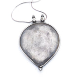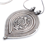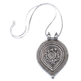 This lovely old amulet from India had a fantastic design featuring a coiled cobra, flanked by two lesser deities. The snake traditionally indicated fertility and this amulet is a double whammy as the inverted tear-drop shape represents the Yoni. Contemporary sterling chain.