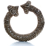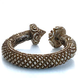 A wild and enormous Rajasthani ankle in deeply with heavy repousse work and rather aggressive lotus finials. It twists to allow room for an ankle but may be best as a collector's item or decorative object.
