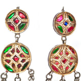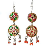 A wonderful and dramatic pair of earrings from Northwestern India. Made of silver metal shaped around a lacquer core and embellished with Jolly Rancher glass in magenta and green apple. Finished with dainty coral drops. Likely not originally earrings, but components of another adornment.