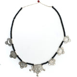 A lovely old Tuareg necklace called "chachatte" from the region of Agadez in Niger composed of silver incised pendants strung on a strand of black seed and pressed dark glass beads at the center. It both has strong resonance with antiquity and an easy modernity. Great on its own or to layer with a messy pile of chains.