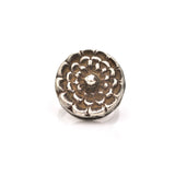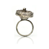 A wonderful ring, with a face like a blooming Chrysanthemum. The body sits high for drama, but the hollow form makes it easy and comfortable to wear. Possibly fashioned from an old South Asian button, it sits a bit cattywampus on the shank.