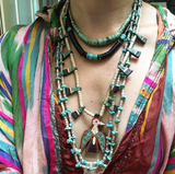 Santo Domingo thunderbird necklace with gypsum, turquoise, and battery beads. During the Depression the Santo Domingo Indians showed ingenuity during hardship by creating these pieces by collecting plastic utensils, batteries, gypsum, and turquoise chips. They would melt down batteries to create the backings and adorn them with found materials. These necklaces were made during a very short period of time by a small community of Indians.