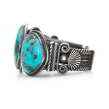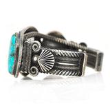 This cuff is made by the late and lauded artist Henry MorganMaterial: Sterling silver, turquoise. It is a work of fine craftsmanship and mastery. The three large and spectacular stones are beautifully matched but they pale compared to the exquisite silversmithing. The design is all hand pulled and twisted wires and stamp work, exhibiting a true artistic vision. Morgan's work has been shown at the Heard Museum and is very rare to the market. Small size.