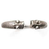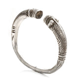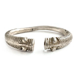 This is a wonderful, blunt cuff from Himachal Pradesh featuring Makara, the dragon-like consort of Shiva that protects against aquatic dangers. This cuff is heavy solid sterling with a nice balanced weight and slight malleability. It has one crack at the center but is perfectly stable and very wearable