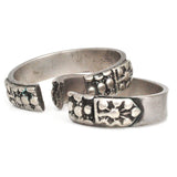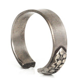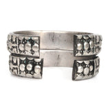 One of my favorite finds in tribal silver is pieces that have both clean, modern lines, and unusual expressions of ornate exuberance. These cuffs fit the bill. They are clean, heavy silver from the front and chunky, textural silver at the finials. Depending on how you wear them, you have two opposing looks. These are large and have lots of silver, but they can be lightly bent to fit a variety of wrist sizes.