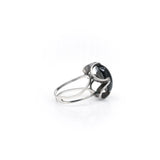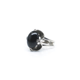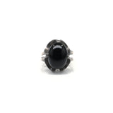 A big onyx cabochon floats int eh grips of 4 sterling claws. A design unique to mid0century Mexico. Set on an adjustable split-shank band.,